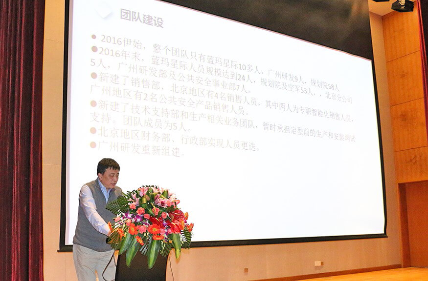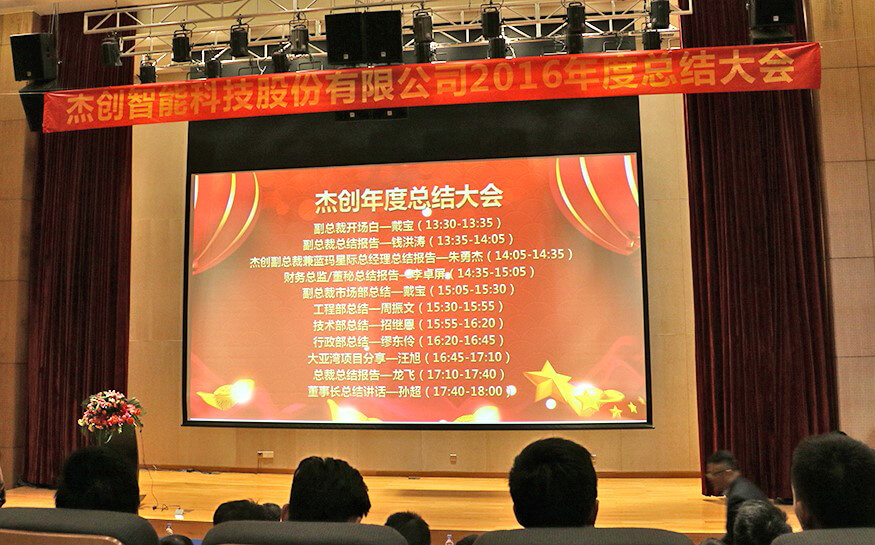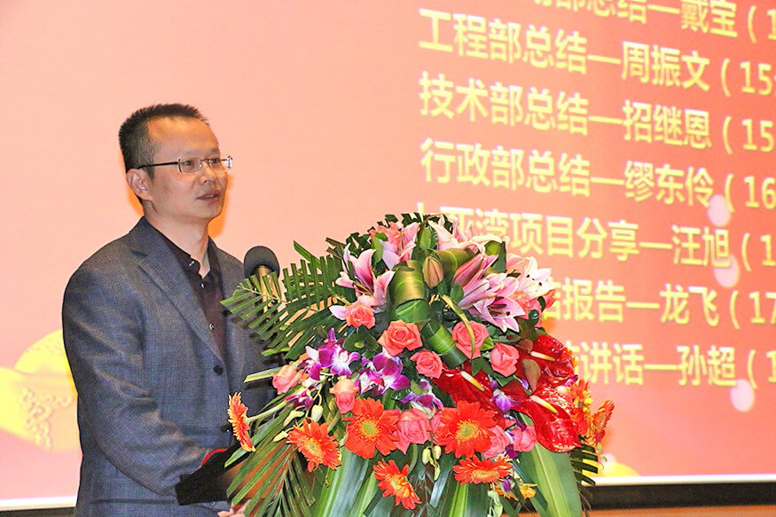 总结大会上,在公司副总裁戴宝先生激情洋溢的开场白后,副总裁钱洪涛先生、星空官网智能董事兼蓝玛星际总经理朱勇杰先生、财务总监兼董秘李卓屏女士、副总裁戴宝先生、工程部总监周振文先生、技术部总监招继恩先生、行政部总监缪东伶女士、工程部副总监汪旭先生、总裁龙飞先生先后登台,分别做了2016年度工作总结。