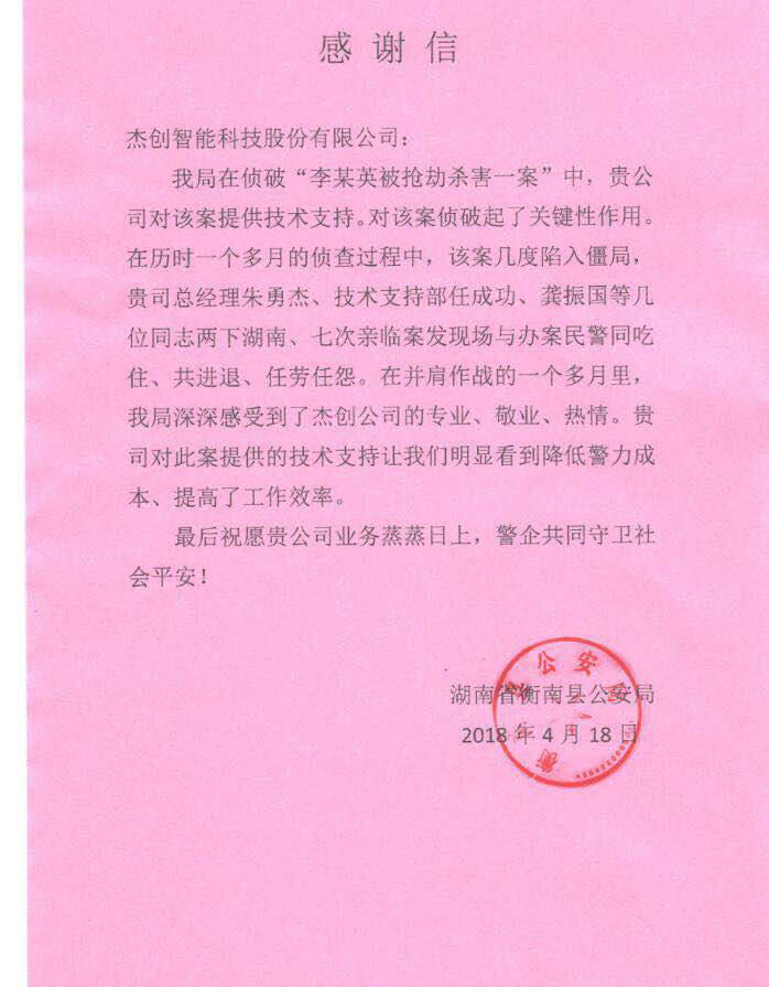 近日,湖南省衡南公安局发来感谢函,对星空官网智能在近期协助侦破“李某英被抢劫杀害一案”表示感谢,目前相关犯罪嫌疑人已被依法刑事拘留,案件正在进一步侦办中。